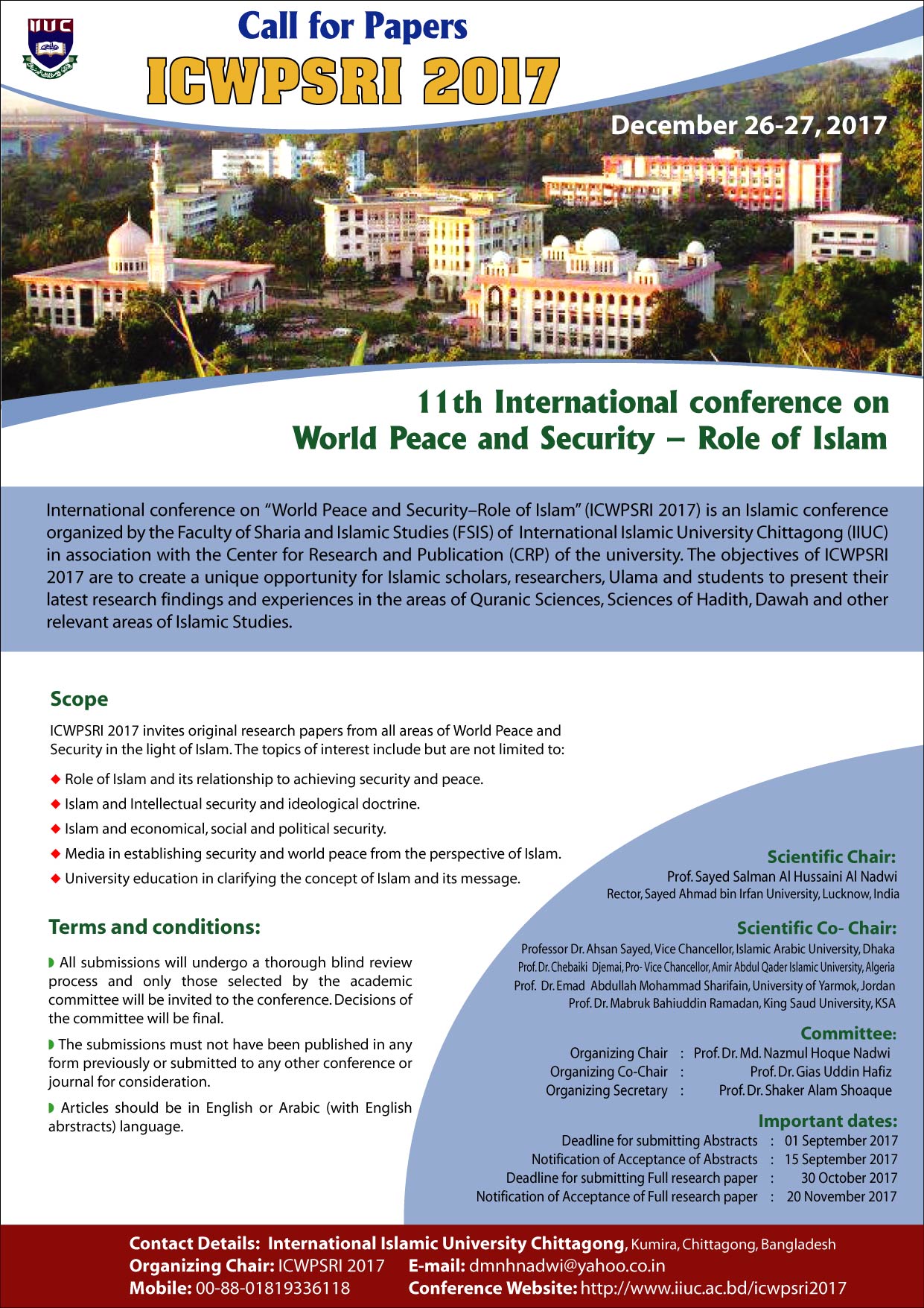 International conference on “World Peace and Security–Role of Islam” (ICWPSRI 2017) is an Islamic conference organized by the Faculty of Sharia and Islamic Studies (FSIS) of International Islamic University Chittagong (IIUC) in association with the Center for Research and Publication (CRP) of the university. The objectives of ICWPSRI 2017 is to crate a unique opportunity for Islamic scholars, researchers, Ulama and students to present their latest research findings and experiences in the areas of Quranic Sciences, Sciences of Hadith, Dawah and other relevant areas of Islamic Studies.